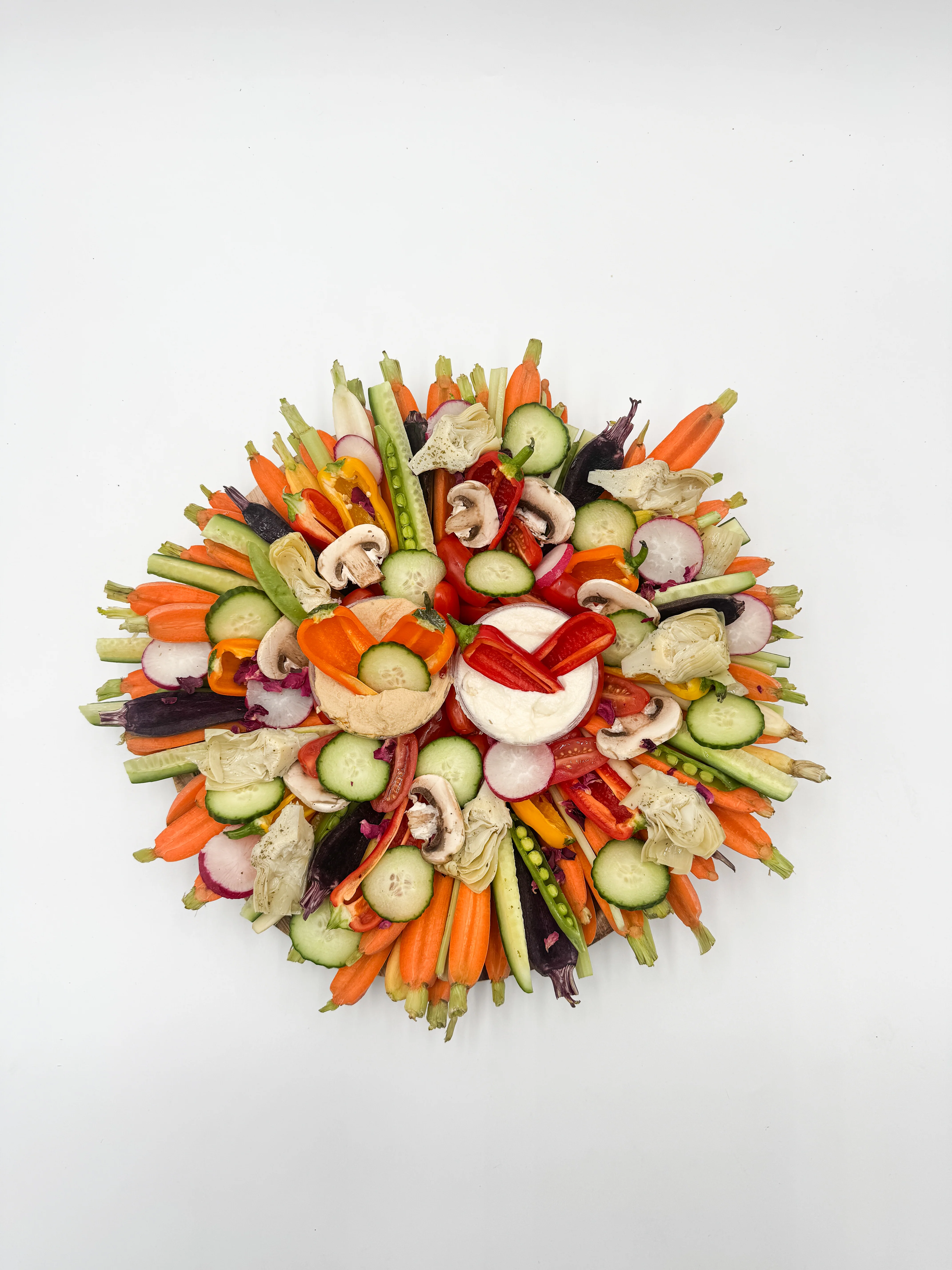 Our Crudité Board is a vibrant medley of the freshest garden-fresh vegetables, meticulously chosen and artistically arranged to please both the eye and the palate. Each element on the board is selected for its exquisite taste and visual appeal to create a refreshing and delightful contrast that suits a wide range of occasions.