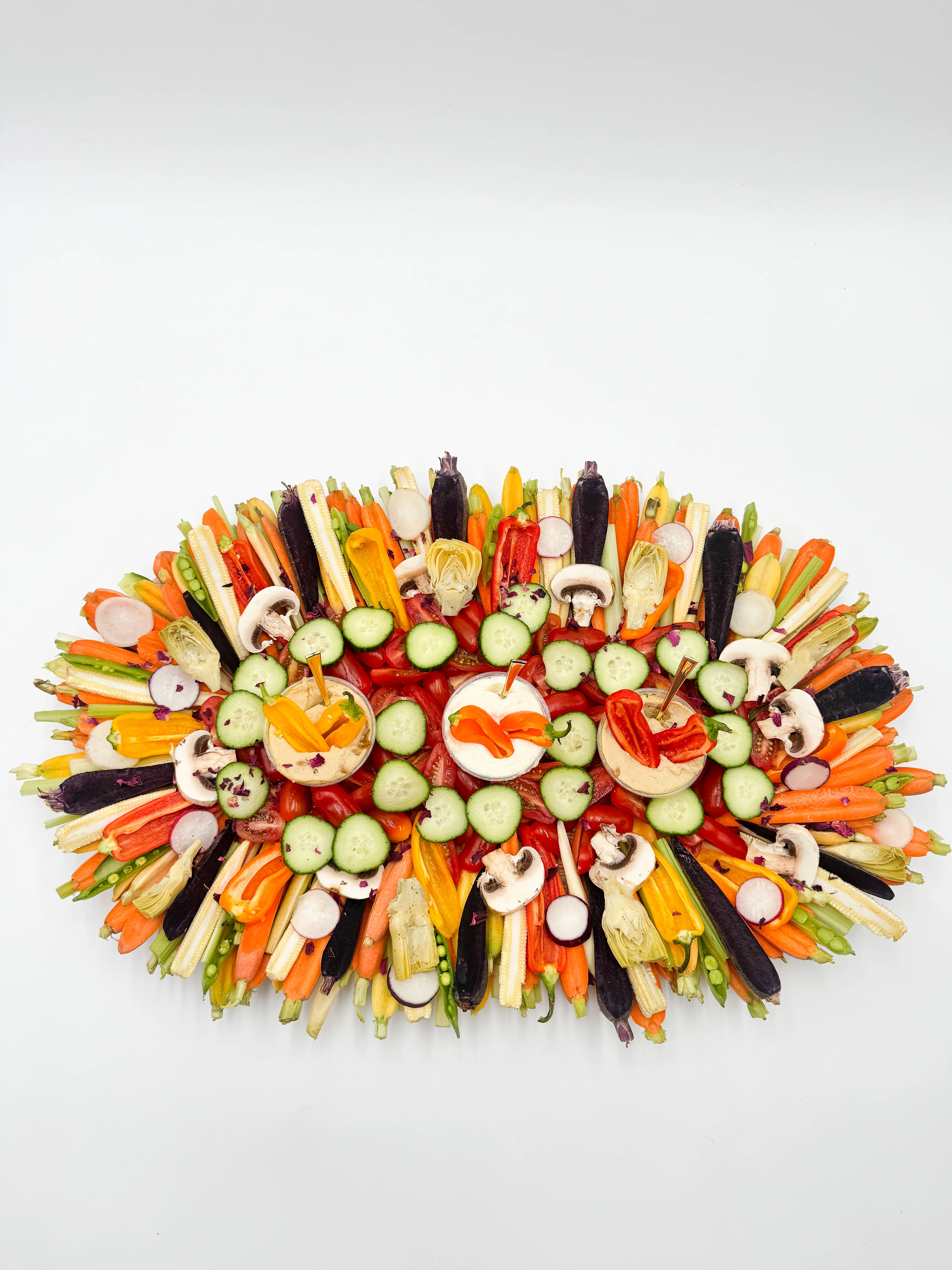 Hosting a larger event? Contact us for custom crudités displays and catering options to elevate your gathering with an artfully arranged vegetable crudité display. Order now for fresh vegetable platter delivery straight to your door!