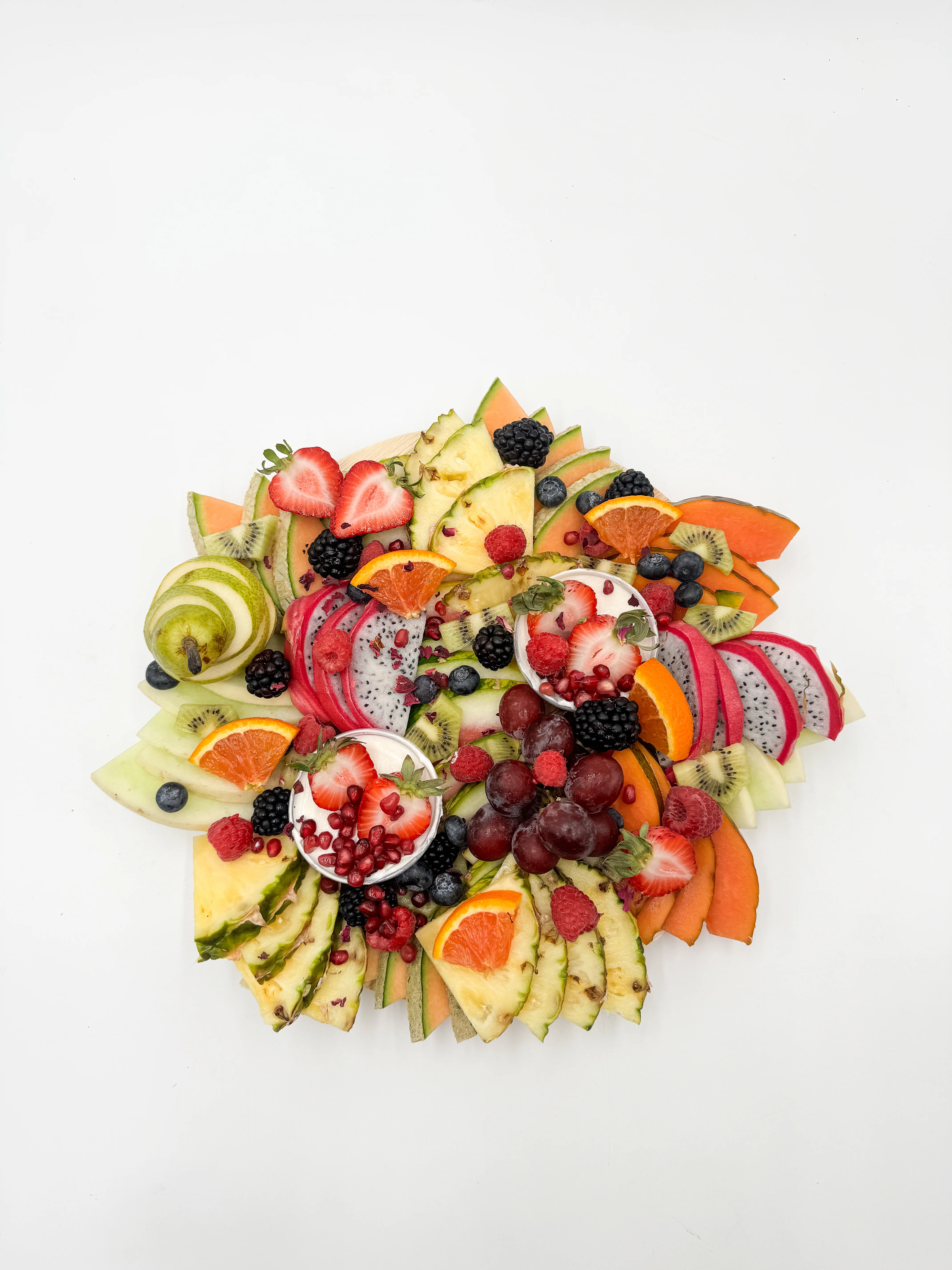 Allow our delicious and fresh fruit and cheese boards to make your life easier for the next time you are hosting an party in Los Angeles or Orange County! Using only the freshest seasonal fruits dipped in honey yogurt, our edible fruit arrangements are LA's favorite crowd-pleaser and will always brighten up everyone's day. Artfully designed with love, our fruit board can cater for every special occasion as a colorful and tasty complement! Individual and picnic fruit boards and cups are also available. Our fruit boards are served in a 12" disposable bamboo leaf plate. We also have a larger fresh fruit party platter for bigger parties. Our customers provide feedback that this fruit board serves 6-8 people.